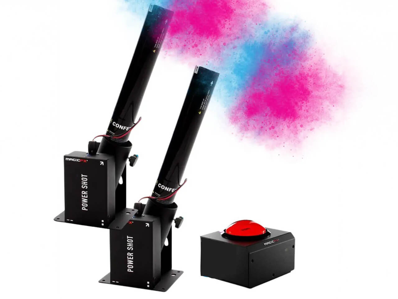 Deze Verhuurset bestaat uit: 1 Lanceerknop met stroomkabel, 2 Powershots met aansluitkabels, 2 Confettibuizen, 1 Baseplate (max 4 Powershots op te plaatsen).