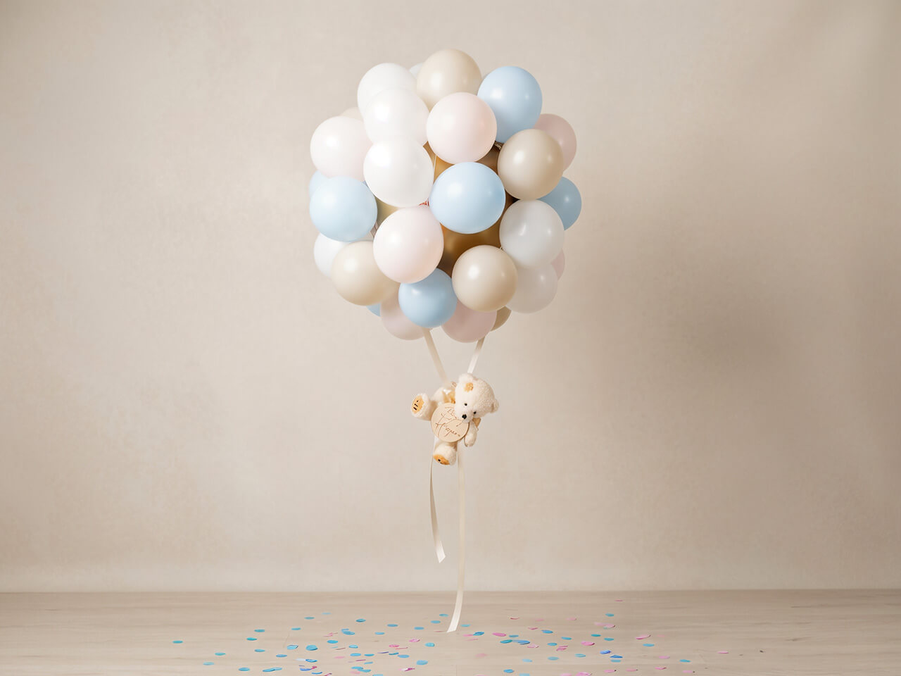 • Meer dan 40 ballonnen in zachte tinten roze, blauw, wit en nude die samen een prachtige tros vormen